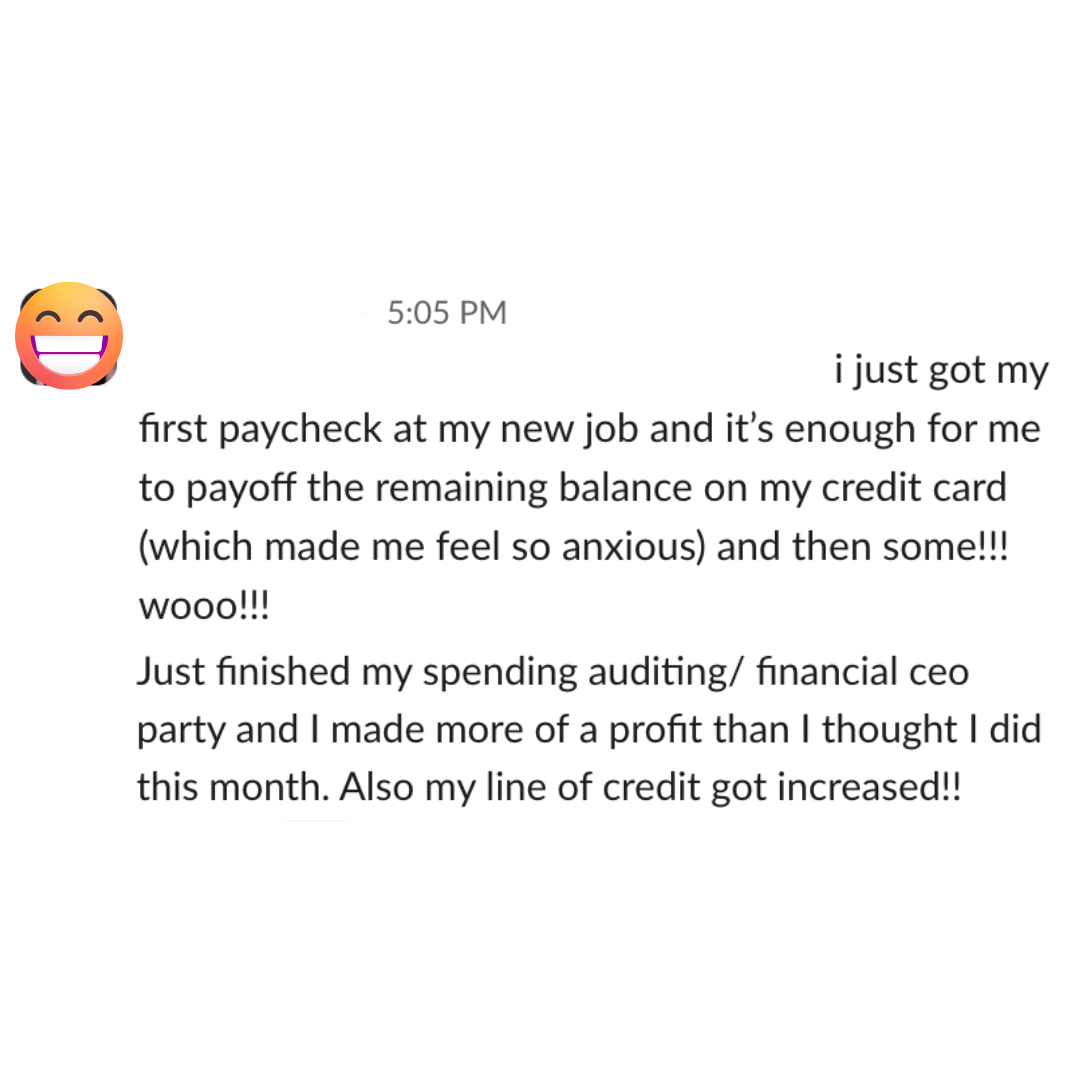 I feel clear and at ease each day. I can make much stronger choices about what to do with my money. Whenever anxiety comes up I can quickly address it with effective solutions! I’m no longer avoidant of my money; I have space to focus on other things and I don't feel like I’m in survival mode all the time. This course has been beyond what I could have ever imagined, it’s way more than a financial organization course, it's a financial mindset course!